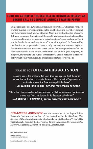 From the author of the bestselling Blowback Trilogy, an urgent call to confront America's waning power In his prophetic book Blowback, published before 9/11, Chalmers Johnson warned that our secret operations in Iraq and elsewhere around the globe would exact a price at home. Now, in a brilliant series of essays written over the last three years, Johnson measures that price and the resulting dangers America faces. Our reliance on Pentagon economics, a global empire of bases, and war without end is, he declares, nothing short of "a suicide option." Dismantling the Empire explores the subjects for which Johnson is now famous, from the origins of blowback to Barack Obama's Afghanistan conundrum, including our inept spies, bad behavior in other countries, ill-fought wars, and capitulation to a military that has taken ever more control of the federal budget. There is, he proposes, only one way out: President Obama must begin to dismantle America's empire of bases before the Pentagon dismantles the American dream. If we do not learn from the fates of past empires, he suggests, our decline and fall are foreordained. This is Johnson at his best: delivering both a warning and a crucial prescription for a remedy.
