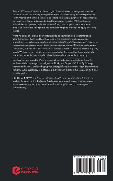 There is relatively little written for White therapists about how they and their White clients can dismantle White supremacy. Drawing attention to this issue, and building support among White practitioners, Jason Brown aims to dismantle White supremacy in professional activities with clients, in the profession itself, and in public policy.