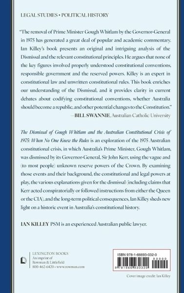 This is an exploration of the 1975 Australian constitutional crisis, in which Australia's Prime Minister, Gough Whitlam, was dismissed by its Governor-General, Sir John Kerr, using the vague and (to most people) unknown reserve powers of the Crown. By examining those events and their background, the constitutional and legal powers at play, the various explanations given for the dismissal (including claims that Kerr acted conspiratorially or followed instructions from either the Queen or the CIA), and the long-term political consequences, Killey sheds new light on a historic event in Australia's constitutional history.