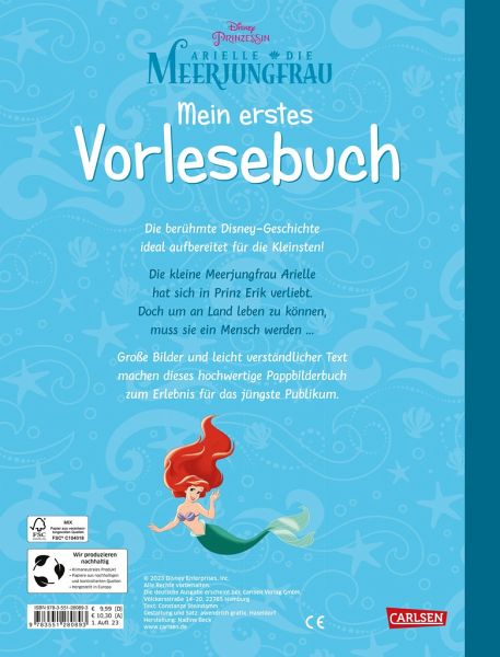Die Abenteuer von Arielle, der Meerjungfrau zählen zu den beliebtesten Disney Märchen aller Zeiten und begeistern Jung und Alt gleichermaßen. Jetzt gibt es den Filmklassiker als großes Pappbilderbuch, um die Geschichte auch den jüngsten Disney-Fans näherzubringen. Dank des altersgerechten Textes und der großformatigen Bilder fällt es Kindergartenkindern leicht, die Erzählung zu verstehen und in die Unterwasserwelt abzutauchen. Der Disney-Klassiker als Vorlesebuch mit wenig Text und den schönsten Bildern aus dem Film Großes Format und robuste Pappseiten - ideal für Jungen und Mädchen ab 3 Jahren Für alle Fans der Disney Prinzessinnen und Märchengeschichten