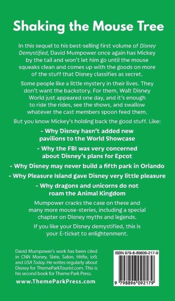 Shaking the Mouse Tree In this sequel to his best-selling first volume of Disney Demystified, David Mumpower once again has Mickey by the tail and won't let him go until the mouse squeaks clean and comes up with the goods on more of the stuff that Disney classifies as secret. Some people like a little mystery in their lives. They don't want the backstory. For them, Walt Disney World just appeared one day, and it's enough to ride the rides, see the shows, and swallow whatever the cast members spoon feed them. But you know Mickey's holding back the good stuff. Like: Why Disney hasn't added new pavilions to the World Showcase Why the FBI was very concerned about Disney's plans for Epcot Why Disney may never build a fifth park in Orlando Why Pleasure Island gave Disney very little pleasure Why dragons and unicorns do not roam the Animal Kingdom Mumpower cracks the case on these and many more mouse-steries, including a special chapter on Disney myths and legends. If you like your Disney demystified, this is your E-ticket to enlightenment.