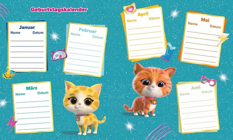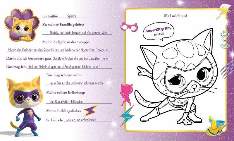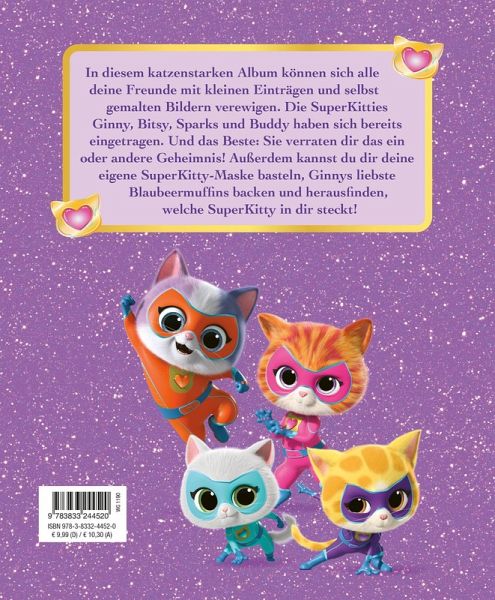 In diesem katzenstarken Album können sich alle deine Freunde mit kleinen Einträgen und selbst gemalten Bildern verewigen. Die SuperKitties Ginny, Bitsy, Sparks und Buddy haben sich bereits eingetragen. Und das Beste: Sie verraten dir das ein oder andere Geheimnis! Außerdem kannst du dir deine eigene SuperKitty-Maske basteln, Ginnys liebste Blaubeermuffins backen und herausfinden, welche SuperKitty in dir steckt!