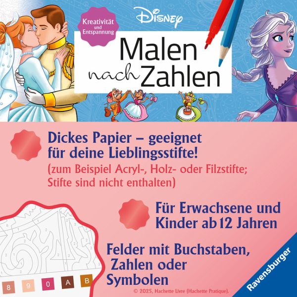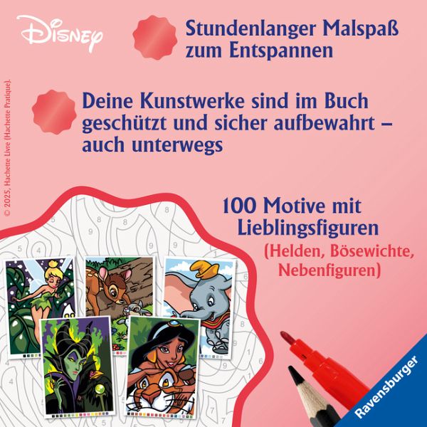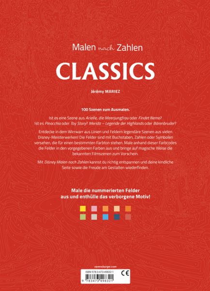 Ist es eine Szene aus Arielle, die Meerjungfrau oder Findet Nemo? Ist es Pinocchio oder Toy Story? Merida - Legende der Highlands oder Bärenbruder? In dem Wirrwarr aus Linien und Feldern gibt es viele legendäre Szenen aus vielen Disney-Meisterwerken zu entdecken. Beim Ausmalen der nummerierten Felder werden nach und nach die verborgenen Motive enthüllt und berühmte Lieblings-Charaktere zum Leben erweckt.