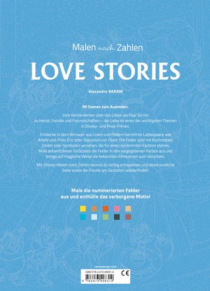 Vom Kennenlernen bis zur Heirat über das Leben als Paar bis hin zu Familie und Freundschaften, die Liebe ist eines der wichtigsten Themen in Disney- und Pixar-Filmen. In dem Wirrwarr aus Linien und Feldern gibt es viele berühmte Liebespaare zu entdecken, wie z.B. Arielle und Prinz Eric oder Rapunzel und Flynn. Beim Ausmalen der nummerierten Felder werden nach und nach die verborgenen Motive enthüllt und berühmte Lieblings-Charaktere zum Leben erweckt.