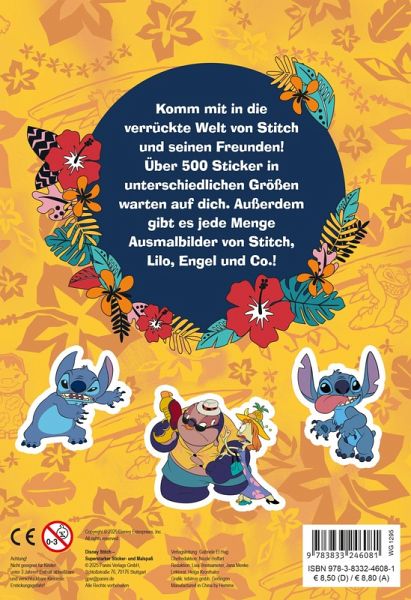 Komm mit in die verrückte Welt von Stitch und seinen Freunden! Über 500 Sticker in unterschiedlichen Größen warten auf dich. Außerdem gibt es jede Menge Ausmalbilder von Stitch, Lilo, Engel und Co.!