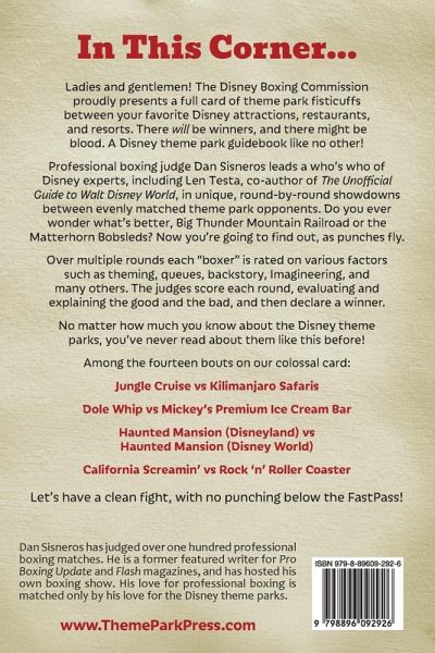 In This Corner... Ladies and gentlemen! The Disney Boxing Commission proudly presents a full card of theme park fisticuffs between your favorite Disney attractions, restaurants, and resorts. There will be winners, and there might be blood. A Disney theme park guidebook like no other! Professional boxing judge Dan Sisneros leads a who's who of Disney experts, including Len Testa, co-author of The Unofficial Guide to Walt Disney World, in unique, round-by-round showdowns between evenly matched theme park opponents. Do you ever wonder what's better, Big Thunder Mountain Railroad or the Matterhorn? Now you're going to find out, as punches fly. Over multiple rounds each "boxer" is rated on various factors such as theming, queues, backstory, Imagineering, and many others. The judges score each round, evaluating and explaining the good and the bad, and then declare a winner. No matter how much you know about the Disney theme parks, you've never read about them like this before! Among the fourteen bouts on our colossal card: Jungle Cruise vs Kilimanjaro Safaris Dole Whip vs Mickey's Premium Ice Cream Bar Haunted Mansion (Disneyland) vs Haunted Mansion (Disney World) California Screamin' vs Rock 'n' Roller Coaster Let's have a clean fight, with no punching below the FastPass!