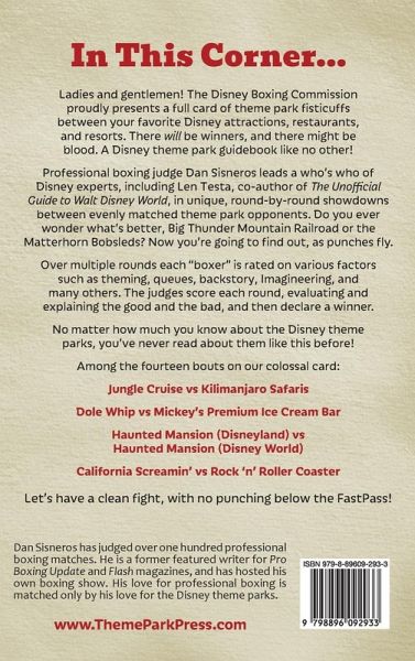 In This Corner... Ladies and gentlemen! The Disney Boxing Commission proudly presents a full card of theme park fisticuffs between your favorite Disney attractions, restaurants, and resorts. There will be winners, and there might be blood. A Disney theme park guidebook like no other! Professional boxing judge Dan Sisneros leads a who's who of Disney experts, including Len Testa, co-author of The Unofficial Guide to Walt Disney World, in unique, round-by-round showdowns between evenly matched theme park opponents. Do you ever wonder what's better, Big Thunder Mountain Railroad or the Matterhorn? Now you're going to find out, as punches fly. Over multiple rounds each "boxer" is rated on various factors such as theming, queues, backstory, Imagineering, and many others. The judges score each round, evaluating and explaining the good and the bad, and then declare a winner. No matter how much you know about the Disney theme parks, you've never read about them like this before! Among the fourteen bouts on our colossal card: Jungle Cruise vs Kilimanjaro Safaris Dole Whip vs Mickey's Premium Ice Cream Bar Haunted Mansion (Disneyland) vs Haunted Mansion (Disney World) California Screamin' vs Rock 'n' Roller Coaster Let's have a clean fight, with no punching below the FastPass!