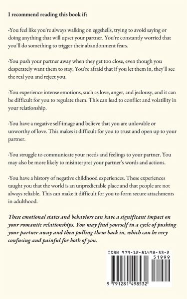 Do you ever feel like you're on a rollercoaster in your relationship? Do you have a deep desire for connection and intimacy, but also a fear of being hurt or abandoned? Do you sometimes find yourself pushing your partner away when they get too close, or clinging to them desperately? Attachment styles are the way we connect with other people. They are formed in early childhood and can have a significant impact on our adult relationships. People with disorganized attachment styles often experience fear and anxiety in intimate relationships. They may have a negative self-image and engage in harmful self-talk. They may also feel intensely lonely, but the stress and fear associated with intimacy can cause them to act erratically and push others away. You're always walking on eggshells, trying to avoid saying or doing anything that will upset your partner. You're constantly worried that you'll do something to trigger their abandonment fears. These experiences can teach you that the world is an unsafe place and that people are not trustworthy. This can make it difficult to form secure attachments in adulthood. I recommend reading this book if: You feel like you're always walking on eggshells, trying to avoid saying or doing anything that will upset your partner. You're constantly worried that you'll do something to trigger their abandonment fears. You push your partner away when they get too close, even though you desperately want them to stay. You're afraid that if you let them in, they'll see the real you and reject you. You experience intense emotions, such as love, anger, and jealousy, and it can be difficult for you to regulate them. This can lead to conflict and volatility in your relationship. You have a negative self-image and believe that you are unlovable or unworthy of love. This makes it difficult for you to trust and open up to your partner. You struggle to communicate your needs and feelings to your partner. You may also be more likely to misinterpret your partner's words and actions. You have a history of negative childhood experiences. These experiences taught you that the world is an unpredictable place and that people are not always reliable. This can make it difficult for you to form secure attachments in adulthood. These emotional states and behaviors can have a significant impact on your romantic relationships. You may find yourself in a cycle of pushing your partner away and then pulling them back in, which can be very confusing and painful for both of you. Instead, the partner who loves someone with disorganized attachment might feel:Confusion and frustration due to erratic and unpredictable behavior. Hurt and loneliness due to difficulty trusting and opening up. Insecurity and anxiety due to fear of abandonment. Resentment and hopelessness due to the challenges of the relationship. It is normal and understandable for the partner to feel this way, but it is important to take steps before the situation becomes irreversible. If you or your loved one has disorganized attachment, this manual can help you move towards secure attachment and build stronger, more loving relationships. With its advice and support, you can learn to create a more secure and fulfilling future for yourselves and your family.