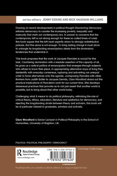 Drawing on recent developments in continental political thought 'Disorienting Democracy' rethinks democracy as a practice that can be used to counter the increasing poverty, inequality and insecurity that mark our contemporary era. In answer to concerns that the contemporary left is not strong enough for these so-called times of crisis this book argues that the left must urgently return to strongly redistributive policies but that this alone is not enough. To bring lasting change it must continually work to untangle its longstanding emancipatory ideals from the dominatory tendencies that have undermined and weakened it throughout the 20th century. In response, this book argues that the work of Jacques Rancière is key. Countering domination with a resolute assertion of the capacities of all he gives us a radical politics of emancipation that emerges through subjects who refuse to know their place. In appropriating alternative ways of living they disidentify with everyday consensus, rupturing and subverting our unequal order to force alternatives onto the agenda. Juxtaposing Rancière with other thinkers from Judith Butler to Jacques Derrida, Woodford draws out the practical ¿implications of Rancière's work for our current time. She develops dissensual practices that provoke us to not just assert that another world is possible, but to bring about that other world today.¿ Challenging what it means to do political philosophy, rethinking the role of critical theory, ethics, education, literature and aesthetics for democracy, and rejecting the longstanding divide between theory and activism, this book will be of particular interest to graduates, scholars and activists.