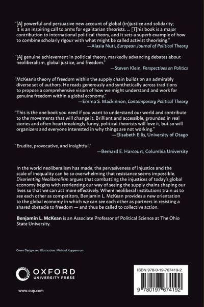 In the world neoliberalism has made, the pervasiveness of injustice and the scale of inequality can be so overwhelming that meaningful resistance seems impossible. Disorienting Neoliberalism argues that combatting the injustices of today's global economy begins with reorienting our way of seeing so that we can act more effectively. Within political theory, standard approaches to global justice envision ideal institutions, but provide little guidance for people responding to today's most urgent problems. Meanwhile, empirical and historical research explains how neoliberalism achieved political and intellectual hegemony, but not how we can imagine its replacement. Disorienting Neoliberalism argues that people can and should become disposed to solidarity with each other once they see global injustices as a limit on their own freedom. Benjamin L. McKean reorients us by taking us inside the global supply chains that assemble clothes, electronics, and other goods, revealing the tension between neoliberal theories of freedom and the hierarchical, coercive reality of their operations. In this new approach to global justice, he explains how neoliberal institutions and ideas constrain the freedom of people throughout the supply chain from worker to consumer. Rather than a linked set of private market exchanges, supply chains are political entities that seek to govern the rest of us. Where neoliberal institutions train us to see each other as competitors, McKean provides a new orientation to the global economy in which we can see each other as partners in resisting a shared obstacle to freedom -- and thus be called to collective action. Drawing from a wide range of thinkers, from Hegel and John Rawls to W. E. B. Du Bois and Iris Marion Young, Disorienting Neoliberalism shows how political action today can be meaningful and promote justice, moving beyond the pity and resentment global inequality often provokes to a new politics of solidarity.
