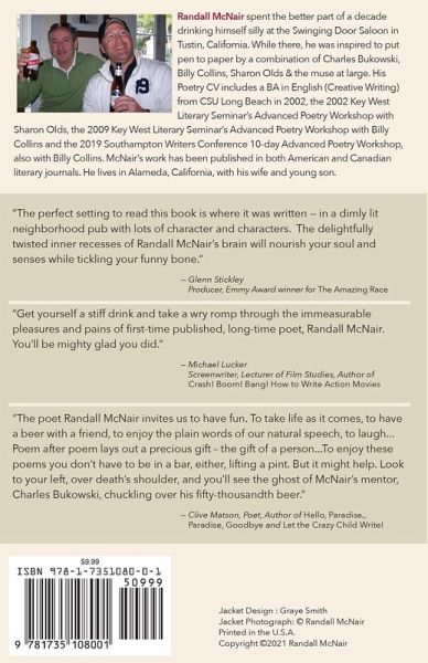 Described by his inner circle as "Poet Laureate of the Absurd," Randall McNair spent the better part of a decade drinking himself silly at the Swinging Door Saloon in Tustin, California. While there, he was inspired to put pen to paper by a combination of Charles Bukowski, Billy Collins, Sharon Olds and the muse at large. His Poetry CV includes a BA in English (Creative Writing) from CSU Long Beach in 2002, the 2002 Key West Literary Seminar's Advanced Poetry Workshop with Sharon Olds, the 2009 Key West Literary Seminar's Advanced Poetry Workshop with Billy Collis and the 2019 Southampton Writers Conference 10-day Advanced Poetry Workshop also with Billy Collins. McNair's work has been published in both American and Canadian literary journals. He lives in Alameda, California, with his wife and young son.