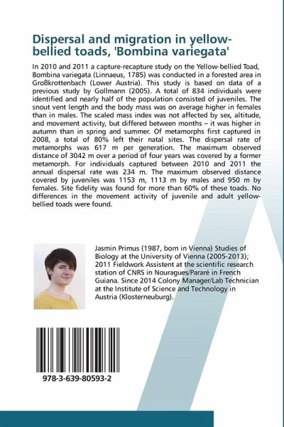 In 2010 and 2011 a capture-recapture study on the Yellow-bellied Toad, Bombina variegata (Linnaeus, 1785) was conducted in a forested area in Großkrottenbach (Lower Austria). This study is based on data of a previous study by Gollmann (2005). A total of 834 individuals were identified and nearly half of the population consisted of juveniles. The snout vent length and the body mass was on average higher in females than in males. The scaled mass index was not affected by sex, altitude, and movement activity, but differed between months - it was higher in autumn than in spring and summer. Of metamorphs first captured in 2008, a total of 80% left their natal sites. The dispersal rate of metamorphs was 617 m per generation. The maximum observed distance of 3042 m over a period of four years was covered by a former metamorph. For individuals captured between 2010 and 2011 the annual dispersal rate was 234 m. The maximum observed distance covered by juveniles was 1153 m, 1113 m by malesand 950 m by females. Site fidelity was found for more than 60% of these toads. No differences in the movement activity of juvenile and adult yellow-bellied toads were found.