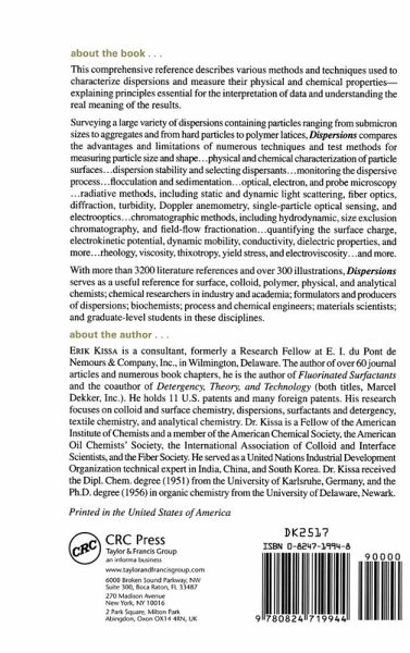 Explaining principles essential for the interpretation of data and understanding the real meaning of the result, this work describes carious methods and techniques used to characterize dispersions and measure their physical and chemical properties. It describes a variety of dispersions containing particles ranging from submicron sizes to aggregates and from hard particles to polymer latices.