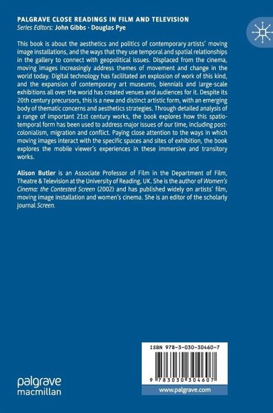 This book is about the aesthetics and politics of contemporary artists' moving image installations, and the ways that they use temporal and spatial relationships in the gallery to connect with geopolitical issues. Displaced from the cinema, moving images increasingly address themes of movement and change in the world today. Digital technology has facilitated an explosion of work of this kind, and the expansion of contemporary art museums, biennales and large-scale exhibitions all over the world has created venues and audiences for it. Despite its 20th century precursors, this is a new and distinct artistic form, with an emerging body of thematic concerns and aesthetics strategies. Through detailed analysis of a range of important 21st century works, the book explores how this spatio-temporal form has been used to address major issues of our time, including post-colonialism, migration and conflict. Paying close attention to the ways in which moving imagesinteract with the specific spaces and sites of exhibition, the book explores the mobile viewer's experiences in these immersive and transitory works.