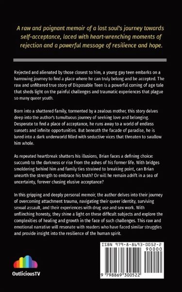Rejected and alienated by those closest to him, a young gay teen embarks on a harrowing journey to find a place where he can truly belong and be accepted. The raw and unfiltered true story of Disposable Teen is a powerful coming of age tale that sheds light on the painful challenges and traumatic experiences that plague so many queer youth. Born into a shattered family, tormented by a zealous mother, this story delves deep into the author's tumultuous journey of seeking love and belonging. Desperate to find a place of acceptance, he runs away to a world of endless sunsets and infinite opportunities. But beneath the facade of paradise, he is lured into a dark underworld filled with seductive vices that threaten to swallow him whole. As repeated heartbreak shatters his illusions, Brian faces a defining choice: succumb to the darkness or rise from the ashes of his former life. With bridges smoldering behind him and family ties strained to breaking point, can Brian unearth the strength to embrace his truth? Or will he remain adrift in a sea of uncertainty, forever chasing elusive acceptance? In this gripping and deeply personal memoir, the author delves into their journey of overcoming attachment trauma, navigating their queer identity, surviving sexual assault, and their experiences with drug use and sex work. With unflinching honesty, they shine a light on these difficult subjects and explore the complexities of healing and growth in the face of such challenges. This raw and emotional narrative will resonate with readers who have faced similar struggles and provide insight into the resilience of the human spirit.