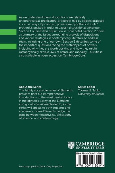 As we understand them, dispositions are relatively uncontroversial 'predicatory' properties had by objects disposed in certain ways. By contrast, powers are hypothetical 'ontic' properties posited in order to explain dispositional behaviour. This Element analyses dispositions and how they might metaphysically explain laws of nature and modality.