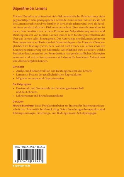 Michael Brandmayr präsentiert eine diskursanalytische Untersuchung eines gegenwärtigen schulpädagogischen Leitbildes von Lernen. Was als ideale Art des Lernens erachtet und wie letztlich in der Schule gelernt wird, wird als Resultat eines gesellschaftlichen Diskurses betrachtet. Eine zentrale Annahme ist dabei, dass Praktiken des Lernens Prozesse von Subjektivierung anleiten und Deutungsmuster von idealem Lernen immer auch Deutungen enthalten, die über das Lernen selbst hinausgehen. Der Autor zeigt eine Rekonstruktion von Deutungsmustern auf Basis von drei Diskurssträngen - der Frage der Chancengleichheit im Bildungssystem, dem Postulat nach Freude am Lernen sowie der Kompetenzorientierung von Unterricht. Abschließend wird diskutiert, welche Funktion dem Lernen bei der Reproduktion von gesellschaftlichen Ideologien zukommt und welche Konsequenzen sich daraus für handelnde Akteurinnen und Akteure ergeben können.