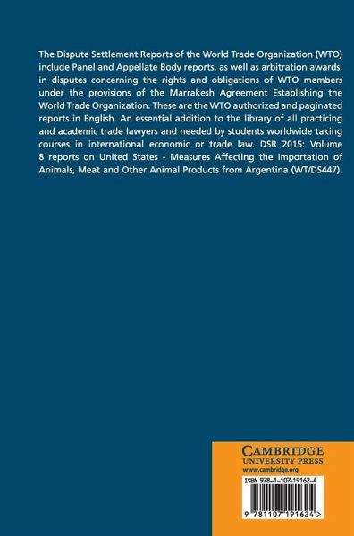 The Dispute Settlement Reports of the World Trade Organization (WTO) include Panel and Appellate Body reports, as well as arbitration awards, in disputes concerning the rights and obligations of WTO members under the provisions of the Marrakesh Agreement Establishing the World Trade Organization. These are the WTO authorized and paginated reports in English. An essential addition to the library of all practicing and academic trade lawyers and needed by students worldwide taking courses in international economic or trade law. DSR 2015: Volume 8 reports on United States - Measures Affecting the Importation of Animals, Meat and Other Animal Products from Argentina (WT/DS447).