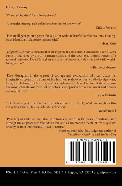 Winner of the Gival Press Poetry Award "Disputed Site marks the arrival of an important new voice in American poetry. With lyricism informed by a truly humane spirit, and the clear-eyed inquisitiveness of a research scientist, Kate Monaghan is a poet of marvelous clarities and wide-world-faring vision." -Bradford Morrow "Kate Monaghan is also a poet of courage and compassion who can adapt her imaginative apparatus to some of the harshest realities of our world-foreign wars, fraught and dangerous borders, people condemned to brutal toil-and show us how our most intimate awareness of ourselves is inseparable from our moral and human responsibilities." -Vijay Seshadri