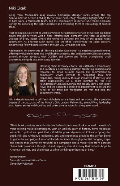 The Heartbeat of Change in America's Landscape In the shadow of Pikes Peak, Colorado Springs serves as the backdrop for a story that reaches into the heart of America's quest for unity and leadership. This tale, rich with the promise of change, is more than a local election narrative. It embodies the nation's yearning for leaders who embody courage, empathy, and humility. Yemi Mobolade's campaign for mayor stands out as a beacon of hope. An immigrant, pastor, and entrepreneur, Mobolade's approach wasn't just about seeking office; it was a mission to infuse politics with core values that often seem forgotten. In a city marked by its military heritage and pioneering spirit, his journey from Nigeria to Colorado Springs epitomizes the American dream, redefined for today. This story is larger than one individual's ascent. It symbolizes a movement towards a politics that elevates collective well-being and seeks unity in shared values. With a team spanning the political spectrum, including his republican campaign manager, Niki Cicak, and democrat campaign strategist, Anthony Carlson, Mobolade's narrative illustrates the power of collaboration. Drawing on a philosophy he embraced as his own-"I am, because we are"-the campaign ignited hope across Colorado Springs. It showcased the power of diverse voices coming together, offering a model for leadership that truly listens and serves with humility. This book invites readers on a journey through a transformative campaign that not only reshaped a city but also offers reflections for a nation in flux. It's a call to believe in the power of unity, respect, and effective leadership to open new chapters in our communities and across the country. Let this story inspire you to believe in the power of leading with our hearts, united by our shared values.
