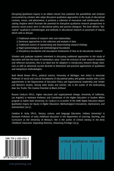 Disrupting Qualitative Inquiry is an edited volume that examines the possibilities and tensions encountered by scholars who adopt disruptive qualitative approaches to the study of educational contexts, issues, and phenomena. It presents a collection of innovative and intellectually stimulating chapters which illustrate the potential for disruptive qualitative research perspectives to advance social justice aims omnipresent in educational policy and practice dialogues. The book defines «disruptive» qualitative methodologies and methods in educational research as processes of inquiry which seek to: