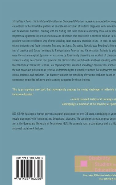 Disrupting Schools: The Institutional Conditions of Disordered Behaviour represents an applied sociological address to the intractable patterns of educational exclusion of students diagnosed with "emotional and behavioural disorders." Starting with the finding that these students commonly share educational trajectories signposted by critical incidents and alienation, this book seeks a scientific solution to this problem via a more reflexive way of understanding these students' practices in situ-in order to avoid critical incidents and foster inclusion. Pursuing this logic, Disrupting Schools uses Bourdieu's theorising of practice and Sacks' Membership Categorisation Analysis and Conversation Analysis to prise open the epistemological dynamics of exclusion by forensically dissecting an incident of classroom violence leading to exclusion. This produces the discovery that institutional conditions operating within teacher-student interactions ensure, via psychologically informed knowledge construction practices, the non-conscious substitution of reflexive understanding for a symbolic violence that underwrites both critical incidents and exclusion. The discovery unlocks the possibility of systemic inclusion based on a consciously controlled reflexive understanding suggested by these findings.