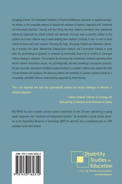Disrupting Schools: The Institutional Conditions of Disordered Behaviour represents an applied sociological address to the intractable patterns of educational exclusion of students diagnosed with "emotional and behavioural disorders." Starting with the finding that these students commonly share educational trajectories signposted by critical incidents and alienation, this book seeks a scientific solution to this problem via a more reflexive way of understanding these students' practices in situ-in order to avoid critical incidents and foster inclusion. Pursuing this logic, Disrupting Schools uses Bourdieu's theorising of practice and Sacks' Membership Categorisation Analysis and Conversation Analysis to prise open the epistemological dynamics of exclusion by forensically dissecting an incident of classroom violence leading to exclusion. This produces the discovery that institutional conditions operating within teacher-student interactions ensure, via psychologically informed knowledge construction practices, the non-conscious substitution of reflexive understanding for a symbolic violence that underwrites both critical incidents and exclusion. The discovery unlocks the possibility of systemic inclusion based on a consciously controlled reflexive understanding suggested by these findings.