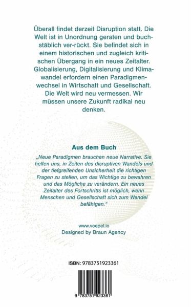 Überall findet derzeit Disruption statt. Die Welt ist in Unordnung geraten und buchstäblich ver-rückt. Sie befindet sich in einem historischen und gleichsam kritischen Übergang in ein neues Zeitalter. Globalisierung, Digitalisierung und Klimawandel erfordern einen Paradigmenwechsel in Wirtschaft und Gesellschaft. Auch die Coronakrise zeigt: Wir müssen unsere Zukunft neu denken. Eine andere Welt ist möglich.