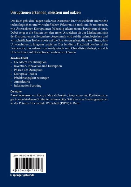 Das Buch geht den Fragen nach, was Disruption ist, wie sie abläuft und welche technologischen und wirtschaftlichen Faktoren sie auslösen. Es untersucht, wie Unternehmen Disruptionen frühzeitig erkennen und bewältigen können. Dabei zeigt es die Phasen von den ersten Anzeichen bis zur Marktdominanz der Disruptoren auf. Besonderes Augenmerk wird auf die technologischen und wirtschaftlichen Treiber sowie auf die Strukturen gelegt, die dazu führen, dass Unternehmen zu langsam reagieren. Der fundierte Praxisteil beschreibt ein Framework, das anhand von Analysetools und Checklisten darlegt, wie sich Unternehmen auf Disruptionen vorbereiten können.