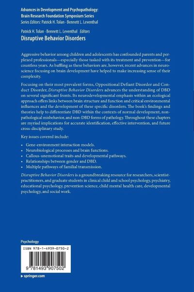 Foreword; Richard Kohn.- 1. Introduction: Connecting Brain Development, Disruptive Behavior and Children; Patrick H. Tolan, Bennett L. Leventhal.- 2. Influences of Gene Environment Interaction Correlation on Disruptive Behavior in the Family Context; Kristine Marceau, Jenae M. Neiderhiser.- 3. Neurobiology of Disruptive Behavior: A Developmental Perspective and Relevant Findings; Elizabeth J. Susman, Seth Pollak.- 4. Callous-Unemotional Traits and Developmental Pathways to the Disruptive Behavior Disorders; Paul J. Frick, R. James Blair, F. Xavier Castellanos.- 5. A Multidimensional Approach to Disruptive Behaviors: Informing Lifespan Research From An Early Childhood Perspective; Alice S. Carter, Sarah A. O. Gray, Raymond H. Baillargeon, Lauren S. Wakschlag.- 6. Gender and the Development of Aggression, Disruptive Behavior and Delinquency from Childhood to Early Adulthood; Rolf Loeber, Deborah M. Capaldi, Elizabeth Costello.- 7. Tracking the Multiple Pathways of Parent and Family Influence on Disruptive Behavior Disorders; Patrick H. Tolan, Kenneth Dodge, Michael Rutter.- 8. Advancing Our Understanding and Interventions for Disruptive Behavior Disorders; Patrick H. Tolan, Bennett L. Leventhal.