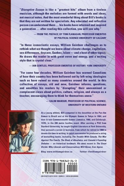 WILLIAM GAIRDNER has published a dozen books, a half-dozen journal articles, and hundreds of insightful essays online. As a consequence, many eager to read his work, are not sure where to begin. Disruptive Essays was created to help them. It is what some call a "Reader," offering a fascinating and varied selection from his bestselling books, articles, and blogs. The disruptive title was chosen because, as Gairdner warns: "There Are No Safe Spaces In This Book!" It's only for those who enjoy deeply-deployed, tough arguments on a wide range of politically-incorrect topics, from the failures of socialism, to the falsities of feminism, to the folly of gay marriage, to the many popular illusions about, well, almost everything. Yes, everything. Readers will come face to face with the perhaps fatal weaknesses of democracy, with Karl Marx, with Lance Armstrong, Rousseau, Hitler, Mill, and Nabokov, and with the broader case for why Liberals and Conservatives will never, ever agree. And more: with the attack on traditional marriage, with sexing society, with objections to global warming, with the war between Christianity and Islam, with moral relativism, and with how there are six kinds of freedom, not just one. This is a book for those keen to challenge themselves with the clarity and controversy of no-holds-barred debate.