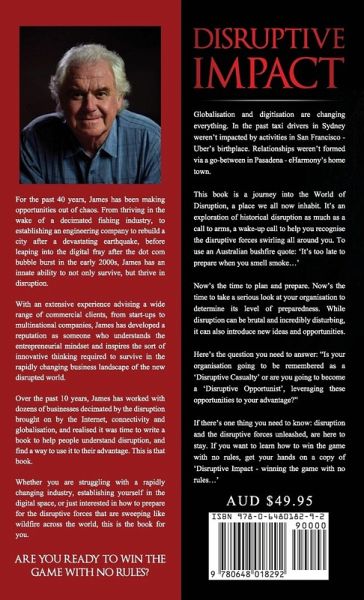 A Disrupted Journey Globalisation and digitisation are changing everything. In the past taxi drivers in Sydney weren't impacted by activities in San Francisco - Uber's birthplace. Relationships weren't formed via a go-between in Pasadena - eHarmony's home town. This book is a journey into the World of Disruption, a place we all now inhabit. It's an exploration of historical disruption as much as a call to arms, a wake-up call to help you recognise the disruptive forces swirling all around you. To use an Australian bushfire quote: 'It's too late to prepare when you smell smoke…' Now's the time to plan and prepare. Now's the time to take a serious look at your organisation to determine its level of preparedness. While disruption can be brutal and incredibly disturbing, it can also introduce new ideas and opportunities. Here's the question you need to answer: "Is your organisation going to be remembered as a 'Disruptive Casualty' or are you going to become a 'Disruptive Opportunist', leveraging these opportunities to your advantage?" If there's one thing you need to know: disruption and the disruptive forces unleashed, are here to stay. If you want to learn how to win the game with no rules, get your hands on a copy of 'Disruptive Impact - winning the game with no rules…'