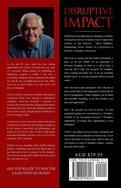 A Disrupted Journey Globalisation and digitisation are changing everything. In the past taxi drivers in Sydney weren't impacted by activities in San Francisco - Uber's birthplace. Relationships weren't formed via a go-between in Pasadena - eHarmony's home town. This book is a journey into the World of Disruption, a place we all now inhabit. It's an exploration of historical disruption as much as a call to arms, a wake-up call to help you recognise the disruptive forces swirling all around you. To use an Australian bushfire quote: 'It's too late to prepare when you smell smoke…' Now's the time to plan and prepare. Now's the time to take a serious look at your organisation to determine its level of preparedness. While disruption can be brutal and incredibly disturbing, it can also introduce new ideas and opportunities. Here's the question you need to answer: "Is your organisation going to be remembered as a 'Disruptive Casualty' or are you going to become a 'Disruptive Opportunist', leveraging these opportunities to your advantage?" If there's one thing you need to know: disruption and the disruptive forces unleashed, are here to stay. If you want to learn how to win the game with no rules, get your hands on a copy of 'Disruptive Impact - winning the game with no rules…'