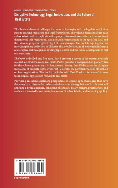 This book addresses challenges that new technologies and the big data revolution pose to existing regulatory and legal frameworks. The volume discusses issues such as blockchain and its implications for property transactions and taxes, three (or four) dimensional title registration, land use and urban planning in the age of big data, and the future of property rights in light of these changes. The book brings together an interdisciplinary collection of chapters that revolve around the potential influence of disruptive technologies on existing legal norms and the future development of real estate markets.