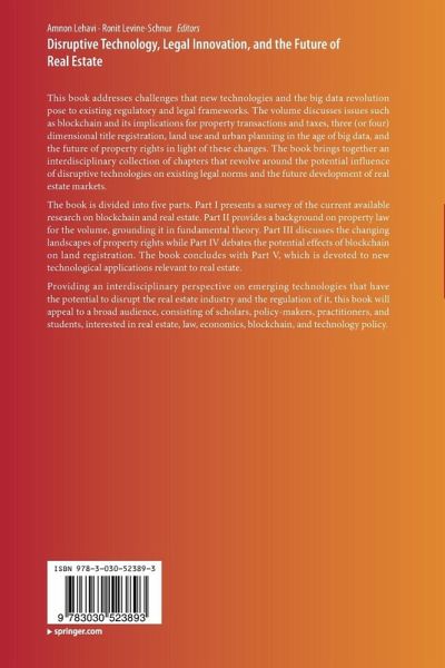This book addresses challenges that new technologies and the big data revolution pose to existing regulatory and legal frameworks. The volume discusses issues such as blockchain and its implications for property transactions and taxes, three (or four) dimensional title registration, land use and urban planning in the age of big data, and the future of property rights in light of these changes. The book brings together an interdisciplinary collection of chapters that revolve around the potential influence of disruptive technologies on existing legal norms and the future development of real estate markets.