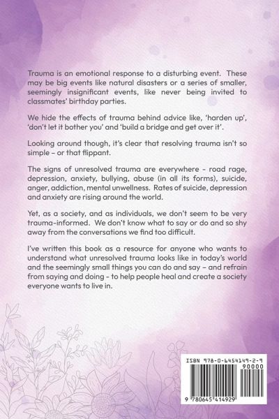 Trauma is an emotional response to a disturbing event. These may be big events like natural disasters or a series of smaller, seemingly insignificant events, like never being invited to classmates' birthday parties. We hide the effects of trauma behind advice like, 'harden up', 'don't like it bother you' and 'build a bridge and get over it'. Looking around though, it's clear resolving trauma isn't that simple - or that flippant. The signs of unresolved trauma are everywhere - road rage, depression, anxiety, bullying, abuse (in all its forms), suicide, anger, addiction, mental unwellness. Rates of suicide, depression and anxiety are rising around the world. Yet, as a society, and as individuals, we don't seem to be very trauma-informed. We don't know what to say or do and so shy away from the conversations we find too difficult. I've written this book as a resource for anyone who wants to understand what unresolved trauma looks like into today's world and the seemingly small things you can do and say - and refrain from saying and doing - to help people heal and create a society everyone wants to live in.