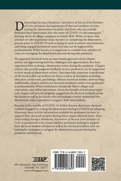 Dissertating During a Pandemic: Narratives of Success from Scholars of Color examines the experiences of doctoral students of color writing the dissertation currently and those who successfully defended their dissertation after the onset of COVID-19 and subsequent shutting down of college campuses in March 2020. While we know that scholars of color experience many barriers to completing the dissertation process prior to COVID-19 such as being in racist academic environments and being engaged in research areas that may not be supported by predominantly White faculty, it is important to consider how scholars of color are managing the dissertation process during this pandemic.We approach this book from an asset-based approach where chapter authors are approaching both the challenges and opportunities they have experienced due to being a dissertation writer during the pandemic. Chapter authors also provide poignant feedback on how professors can be supportive to their needs as dissertation writers. One especially important contribution of this book is that our authors are from a variety of disciplines including: education, social work, psychology, African American studies, and sociology. Additionally, chapter authors are doctoral candidates (and recent graduates) at predominantly White institutions, historically Black colleges and universities, and online universities. Given the breadth of institution types each chapter will provide poignant suggestions for doctoral students across the nation as well as for faculty who are looking to better understand the dissertation writer experience to support their own students. Because of the novelty of COVID-19, little is known about how doctoral students engaged in writing the dissertation during COVID19 are adapting. Moreover, there is little information available for professors on how to support their doctoral students during these unprecedented times. Thus, Dissertating During a Pandemic: Narratives of Success from Scholars of Color is positioned to be a must read for professors looking to support their doctoral student advisees as well as for doctoral students who are looking for strategies to navigate the dissertation process during the pandemic and beyond.