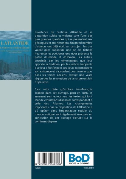 L'existence de l'antique Atlantide et sa disparition subite et violente sont l'une des plus grandes questions qui se présentent aux géologues et aux historiens. Un grand nombre d'auteurs ont déjà écrit sur ce sujet : les uns voient dans l'Atlantide une de ces fictions heureuses et poétiques que nous présente la patrie d'Hésiode et d'Homère; les autres, entraînés par les témoignages que leur apporte la tradition, par les indices frappants que leur offre l'aspect des lieux, reconnaissent son existence et s'accordent pour assurer que, dans les temps anciens, existait une vaste région que les révolutions de la nature ont fait disparaître...C'est cette piste qu'explore Jean-François Jolibois dans cet ouvrage, paru en 1846, et amenant son lecteur vers les textes qui font état de civilisations disparues correspondant à celle des Atlantes. Les changements importants que la disparition de l'Atlantide a dû opérer dans l'organisation sociale du monde antique sont également évoqués en conclusion de cet ouvrage d'érudit sur le continent disparu.