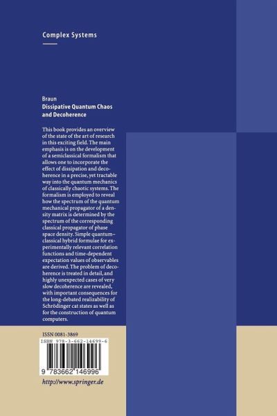 Dissipative Quantum Chaos and Decoherence provides an overview of the state of the art of research in this exciting field. The main emphasis is on the development of a semiclassical formalism that allows one to incorporate the effect of dissipation and decoherence in a precise, yet tractable way into the quantum mechanics of classically chaotic systems. The formalism is employed to reveal how the spectrum of the quantum mechanical propagator of a density matrix is determined by the spectrum of the corresponding classical propagator of phase space density. Simple quantum--classical hybrid formulae for experimentally relevant correlation functions and time-dependent expectation values of observables are derived. The problem of decoherence is treated in detail, and highly unexpected cases of very slow decoherence are revealed, with important consequences for the long-debated realizability of Schrödinger cat states as well as for the construction of quantum computers.