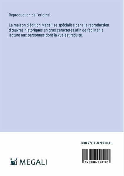 Reproduction de l'original. La maison d'édition Megali se spécialise dans la reproduction d'¿uvres historiques en gros caractères afin de faciliter la lecture aux personnes dont la vue est réduite.