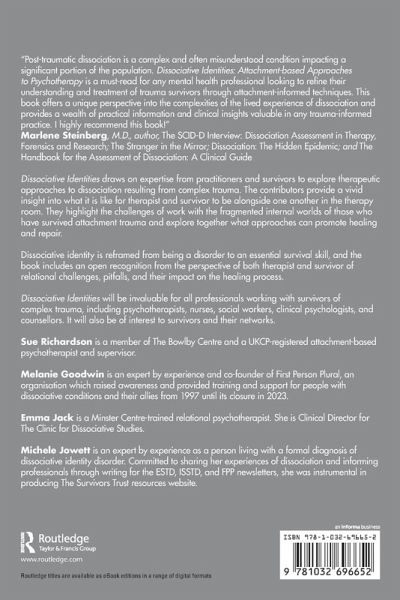Sue Richardson is a member of The Bowlby Centre and a UKCP-registered attachment-based psychotherapist and supervisor. Melanie Goodwin is an expert by experience and co-founder of First Person Plural, an organisation which raised awareness and provided training and support for people with dissociative conditions and their allies from 1997 until its closure in 2023. Emma Jack is a Minster Centre-trained relational psychotherapist. She is Clinical Director for The Clinic for Dissociative Studies. Michele Jowett is an expert by experience as a person living with a formal diagnosis of dissociative identity disorder. Committed to sharing her experiences of dissociation and informing professionals through writing for the ESTD, ISSTD, and FPP newsletters, she was instrumental in producing The Survivors Trust resources website.