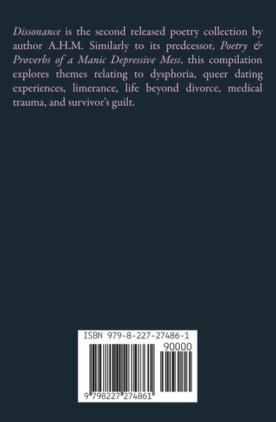 Dissonance is the second released poetry collection by author A.H.M. Similarly to its predcessor, Poetry & Proverbs of a Manic Depressive Mess, this compilation explores themes relating to dysphoria, queer dating, limerance, life beyond divorce, medical trauma, and survivor's guilt.