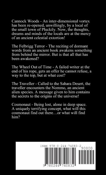 Cannock Woods - An inter-dimensional vortex has been re-opened, unwillingly, by a local of the small town of Pluckily. Now, the thoughts, dreams and minds of the locals are at the mercy of an ancient celestial extortion! The Felbrigg Terror - The reciting of dormant words from an ancient book awakens something from behind the mirror. But is that all that has been awakened? The Wheel Out of Time - A failed writer at the end of his rope, gets an offer he cannot refuse, a way to the top, but at what cost? The Traveller - Called to the Sahara Desert, the traveller encounters the Nommo, an ancient alien species. A message given to him contains the secrets to the origins of the universe! Cosmonaut - Being lost, alone in deep space. A uniquely terrifying concept, what will this cosmonaut find out there...or what will find him?