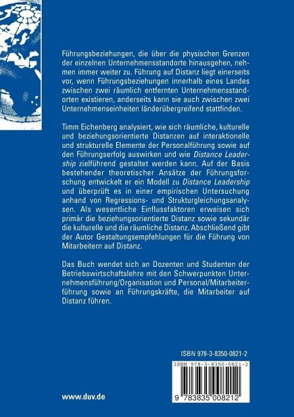 Timm Eichenberg analysiert, wie sich räumliche, kulturelle und beziehungsorientierte Distanzen auf interaktionelle und strukturelle Elemente der Personalführung sowie auf den Führungserfolg auswirken und wie Distance Leadership zielführend gestaltet werden kann. Auf der Basis bestehender theoretischer Ansätze der Führungsforschung entwickelt er ein Modell zu Distance Leadership und überprüft es in einer empirischen Untersuchung anhand von Regressions- und Strukturgleichungsanalysen. Als wesentliche Einflussfaktoren erweisen sich primär die beziehungsorientierte Distanz sowie sekundär die kulturelle unddie räumliche Distanz. Abschließend gibt der Autor Gestaltungsempfehlungen für die Führung von Mitarbeitern auf Distanz.