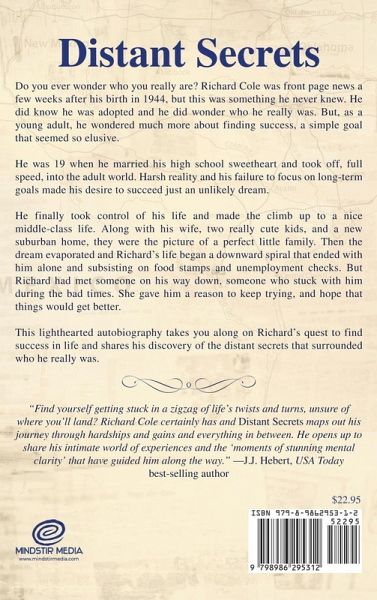 Do you ever wonder who you really are? Richard Cole was front page news a few weeks after his birth in 1944, but this was something he never knew. He did know he was adopted and he did wonder who he really was. But, as a young adult, he wondered much more about finding success, a simple goal that seemed so elusive. He was 19 when he married his high school sweetheart and took off, full speed, into the adult world. Harsh reality and his failure to focus on long-term goals made his desire to succeed just an unlikely dream. He finally took control of his life and made the climb up to a nice middle-class life. Along with his wife, two really cute kids, and a new suburban home, they were the picture of a perfect little family. Then the dream evaporated and Richard's life began a downward spiral that ended with him alone and subsisting on food stamps and unemployment checks. But Richard had met someone on his way down, someone who stuck with him during the bad times. She gave him a reason to keep trying, and hope that things would get better. This lighthearted autobiography takes you along on Richard's quest to find success in life and shares his discovery of the distant secrets that surrounded who he really was. "Find yourself getting stuck in a zigzag of life's twists and turns, unsure of where you'll land? Richard Cole certainly has and Distant Secrets maps out his journey through hardships and gains and everything in between. He opens up to share his intimate world of experiences and the "moments of stunning mental clarity" that have guided him along the way." -J.J. Hebert, USA Today best-selling author