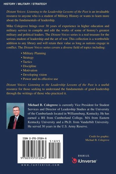 Distant Voices: Listening to the Leadership Lessons of the Past is an invaluable resource to anyone who is a student of Military History or wants to learn more about the fundamentals of leadership. Mike Colegrove brings over 30 years of experience in higher education and military service to compile and edit the works of some of history's greatest military and political leaders. The Distant Voices series is a real treasure for the serious student of leadership and the art of war. This collection is a worthwhile addition to any library and will retain their value as long as nations engage in conflict. The Distant Voices series covers a diverse field of topics including: Military Planning Strategy Tactics Discipline Motivation Developing vision Power and its effective use Distant Voices: Listening to the Leadership Lessons of the Past is a useful resource for those seeking to understand the fundamentals of good leadership through the writings of those who practiced it.