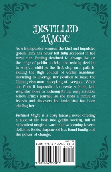 As a transgender woman, the kind and impulsive goblin Trinx has never felt fully accepted in her rural clan. Feeling destined to always live on the edge of goblin society, she naively decides to adopt a child as the first step on a path to joining the High Council of Goblin Grandmas, intending to leverage her position to make the Chubug clan more accepting of everyone. When she finds it impossible to create a family this way, she looks to alchemy for an easy solution. Follow Trinx's journey as she finds a family of friends and discovers the truth that has been eluding her. Distilled Magic is a cozy fantasy novel offering a slice-of-life look into goblin society, full of alchemical magic, a warm and welcoming tavern, delicious foods, dragonroot tea, found family, and the power of change.