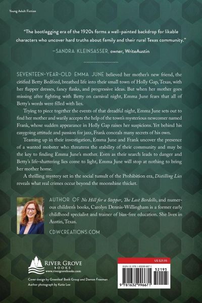 Seventeen-year-old Emma June believed her mother's new friend, the citified Betty Bedford, breathed life into their small town of Holly Gap, Texas, with her flapper dresses, fancy flasks, and progressive ideas. But when her mother goes missing after fighting with Betty on carnival night, Emma June fears that all of Betty's words were filled with lies. Trying to piece together the events of that dreadful night, Emma June sets out to find her mother and warily accepts the help of the town's mysterious newcomer named Frank, whose sudden appearance in Holly Gap raises her suspicions. Yet behind his easygoing attitude and passion for jazz, Frank conceals many secrets of his own. Teaming up in their investigation, Emma June and Frank uncover the presence of a wanted mobster who threatens the stability of their community and may be the key to finding Emma June's mother. Even as their search leads to danger and Betty's life-shattering lies come to light, Emma June will stop at nothing to bring her mother home. A thrilling mystery set in the social tumult of the Prohibition era, Distilling Lies reveals what real crimes occur beyond the moonshine thicket.