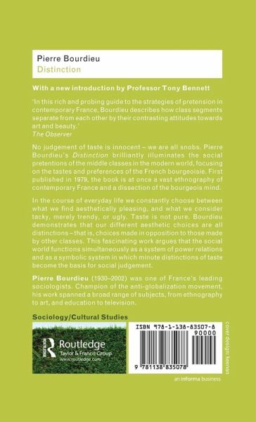 No judgement of taste is innocent - we are all snobs. Pierre Bourdieu's Distinction brilliantly illuminates the social pretentions of the middle classes in the modern world, focusing on the tastes and preferences of the French bourgeoisie. First published in 1979, the book is at once a vast ethnography of contemporary France and a dissection of the bourgeois mind. In the course of everyday life we constantly choose between what we find aesthetically pleasing, and what we consider tacky, merely trendy, or ugly. Taste is not pure. Bourdieu demonstrates that our different aesthetic choices are all distinctions - that is, choices made in opposition to those made by other classes. This fascinating work argues that the social world functions simultaneously as a system of power relations and as a symbolic system in which minute distinctions of taste become the basis for social judgement.
