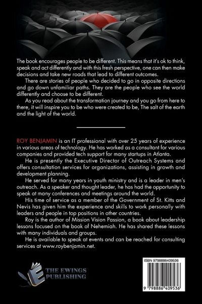 The book encourages people to be different. This means that it's ok to think, speak and act differently and with this fresh perspective, one can then make decisions and take new roads that lead to different outcomes. There are stories of people who decided to go in opposite directions and go down unfamiliar paths. They are the people who see the world differently and choose to be different. As you read about the transformation journey and you go from here to there, it will inspire you to be who were created to be, The salt of the earth and the light of the world.